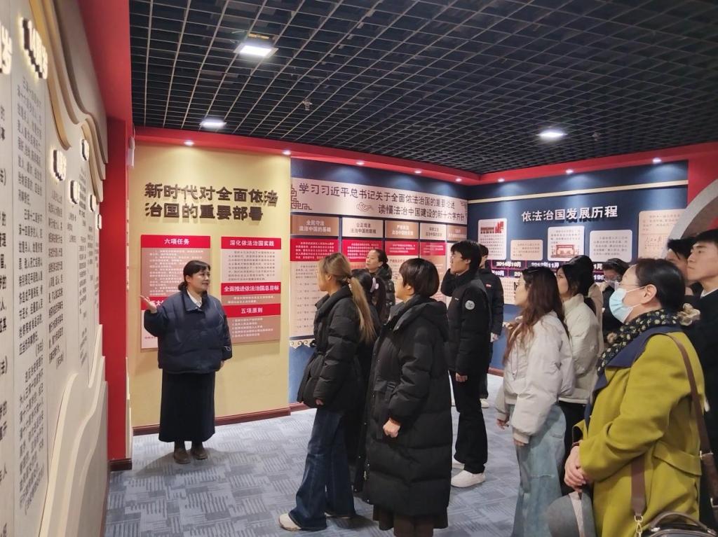 在基地讲解员的带领下,师生依次参观各主题展区。展区通过丰富史料、典型案例等,系统展现了我国宪法发展历程、法治建设成就,以及法治在地方治理、民族团结与生态保护中的生动实践。党员教师率先垂范,认真聆听,不时与学生交流讨论,结合专业特点和生活实际,引导学生理解宪法法律与日常学习生活的紧密联系,领悟“坚持全面依法治国”的基本方略。活动现场党团联动、师生共学,充分体现了党组织对青年思想的引领作用,形成了党员带头学、团员青年跟着学的良好氛围,生动诠释了“党建带团建”的引领实效。